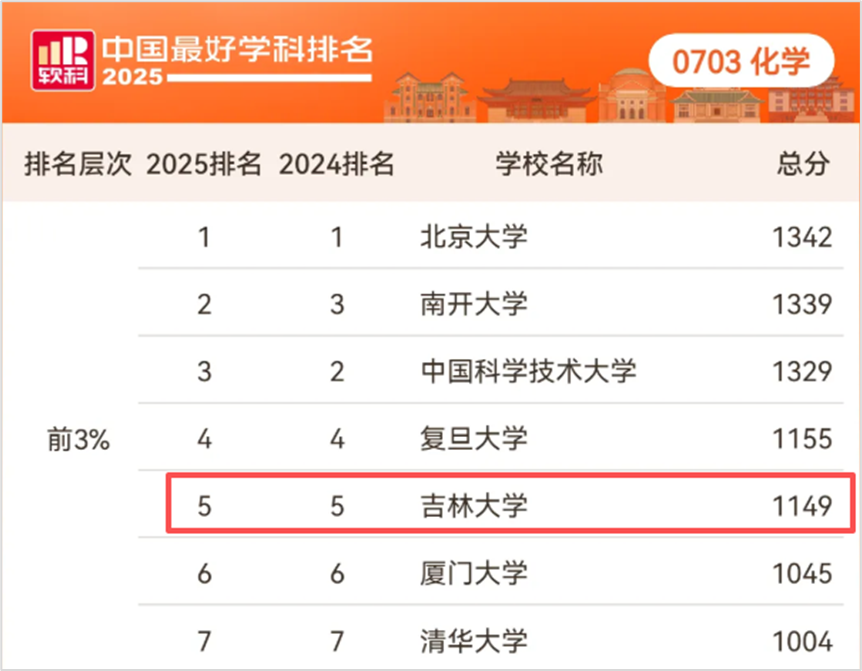 化学学科再度位列全国第5位,连续入选“中国顶尖学科”(全国排名前3%或前2名学科)。
