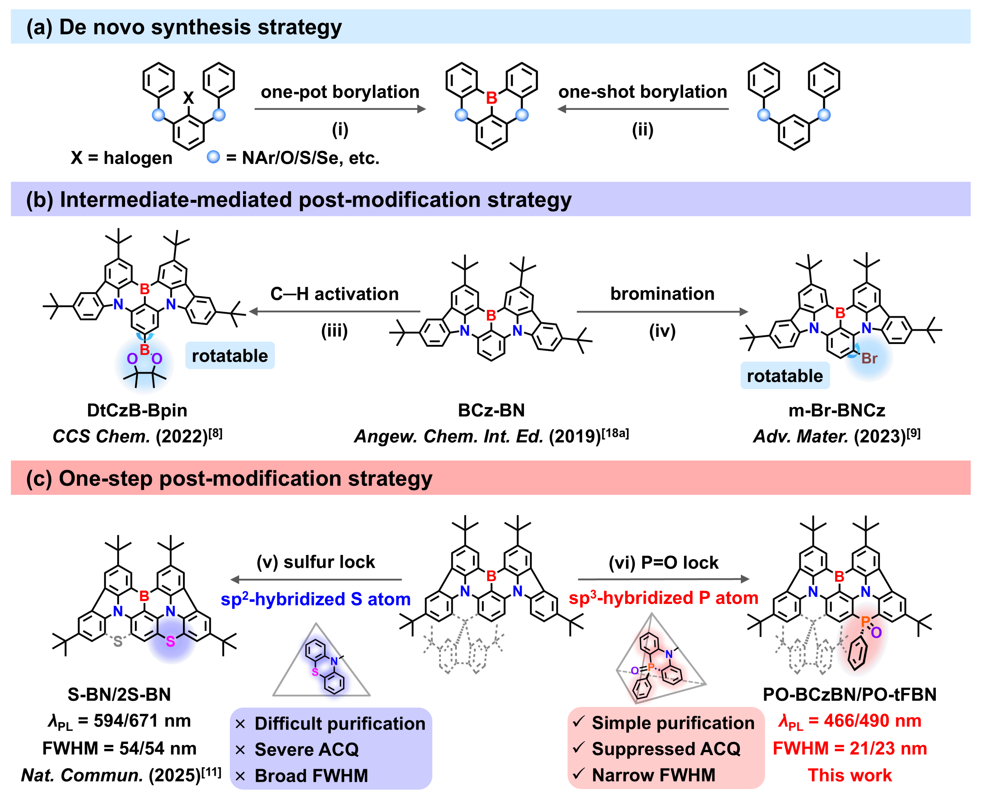 多共振型热活化延迟荧光(MR-TADF)材料兼具高效率与窄带发射特性,是实现广色域有机发光二极管(OLED)的关键发光层材料。目前,B/N骨架的MR-TADF材料主要采用从头合成策略,即通过逆合成分析巧妙设计硼化前体,后通过一锅硼化法(one-pot borylation)或一步硼化法(one-shot borylation),将其转化为目标化合物。迄今为止,该策略得到了广泛的发展,制备了大量的高效率、窄带发射的OLED器件,然而,在构筑MR-TADF分子时仍面临一些挑战,例如反应位点的控制以及在优化分子性质时耗时的合成步骤。