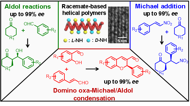 针对上述挑战,吴宗铨教授团队利用高对映选择性活性聚合,将外消旋单体精准转化为单一螺旋手性聚合物,为廉价外消旋原料制备高性能手性材料开辟了新路径。团队系统阐明了“螺旋手性主导”的对映选择性机制,首次证实聚合物主链的宏观螺旋构象才是调控催化立体选择性的核心,而非侧链局部手性。基于此设计的螺旋聚合物催化剂在Aldol反应、Michael加成和Domino oxa-Michael/Aldol缩合等多种不对称反应中均展现优异活性与对映选择性,兼具均相催化的高效与多相催化的易回收优势,可循环使用至少5次而活性几乎不衰减。