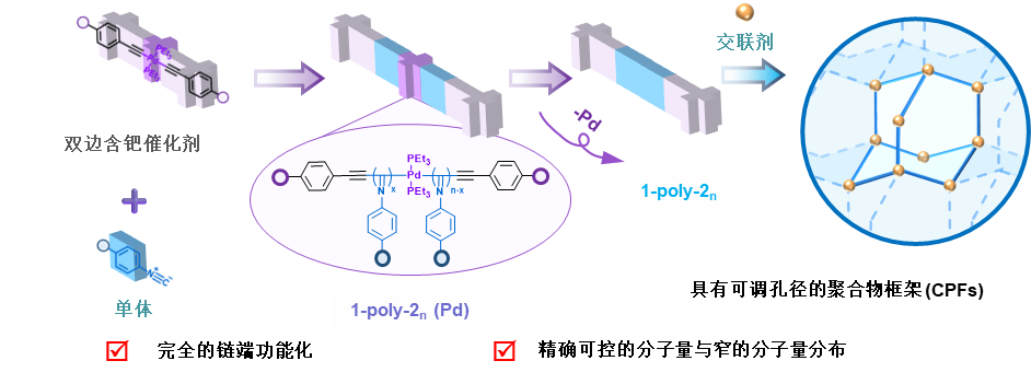 高分子的起始端和链末端功能化一般需要通过多步功能化反应,合成路线繁杂。针对上述挑战,吴宗铨教授团队设计并合成了一类双功能化的炔钯催化剂,其本身可以预制功能基团,这种引发多种异腈单体活性聚合,得到双端基功能化的螺旋聚异腈。得益于其对分子量的精确控制与窄的分子量分布,该团队通过这种活性聚合的策略得到了一类刚性棒状遥爪螺旋聚异腈,在经历脱钯还原消除后,其与交联剂反应得到了一类孔径可调控的聚异腈框架(CPFs)。