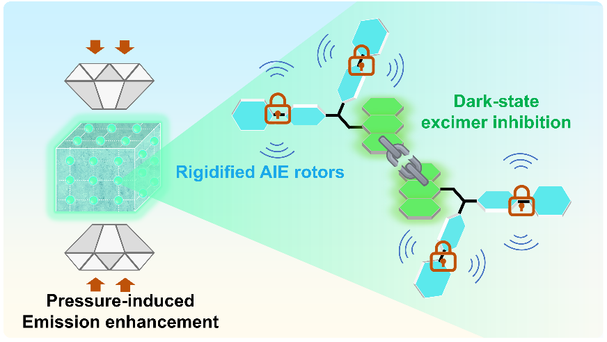 有机共轭体系在外部压力刺激下的光学响应行为是光电功能材料领域的研究重点之一。然而,在高压环境下实现高效发光面临严峻挑战:随着晶格被压缩,分子间距离显著缩短,增强的π–π作用极易诱导非辐射“暗态”激基缔合物(excimer)的形成,导致普遍观察到的荧光猝灭现象。尽管聚集诱导发光(aggregation-induced emission,AIE)策略使材料在常压下表现优异,但在高压下的紧密堆积中,如何有效规避暗态激基缔合物“陷阱”,并同时激活AIE效应,实现压致发光增强(pressure-induced emission enhancement, PIEE),仍是该领域亟待解决的科学问题。