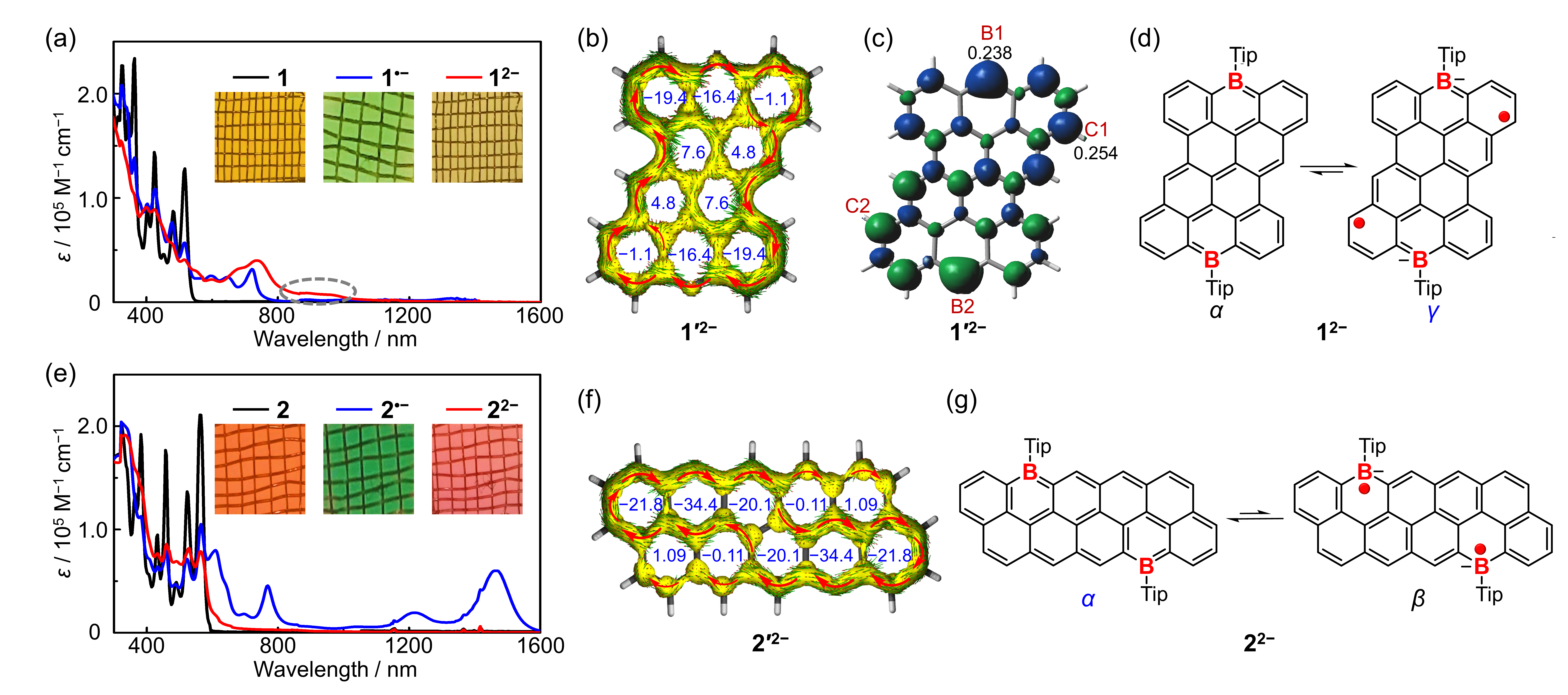 1和2均表现出两个可逆的还原过程,说明可产生稳定的还原态物种。因此,作者对它们实施了电化学还原测试,并使用紫外-可见-近红外吸收光谱原位监测了二价阴离子物种的形成。如图4所示,1和2表现出两个清晰的得电子还原过程,溶液颜色发生了明显改变。1′2‒在800‒1000nm处显示出一个弱的低能吸收带,该特征通常与自由基结构相关,证明其可能具有开壳结构。为深入研究硼原子引入对电子结构的调控作用,以及二价阴离子的芳香性和开壳/闭壳性质,作者对二价阴离子和对应的纯碳等电子体进行了DFT理论计算,结果表明在二价阴离子中,1)硼原子的引入增强了含硼环的芳香性,并扰动了邻近环的芳香性;2)二价阴离子与其全碳等电子体保持了类似的开壳/闭壳特征,但是对于开壳结构的1′2‒,硼原子的引入使其自旋密度重新分布,自由基主要分布在C1和C2位置,γ共振结构对其基态贡献更大。此外,2′2‒保持了闭壳结构,α共振结构在基态中占据主导地位。这些结果表明硼原子对并苯骨架的电子结构、芳香性及自旋特性的重要调控作用。