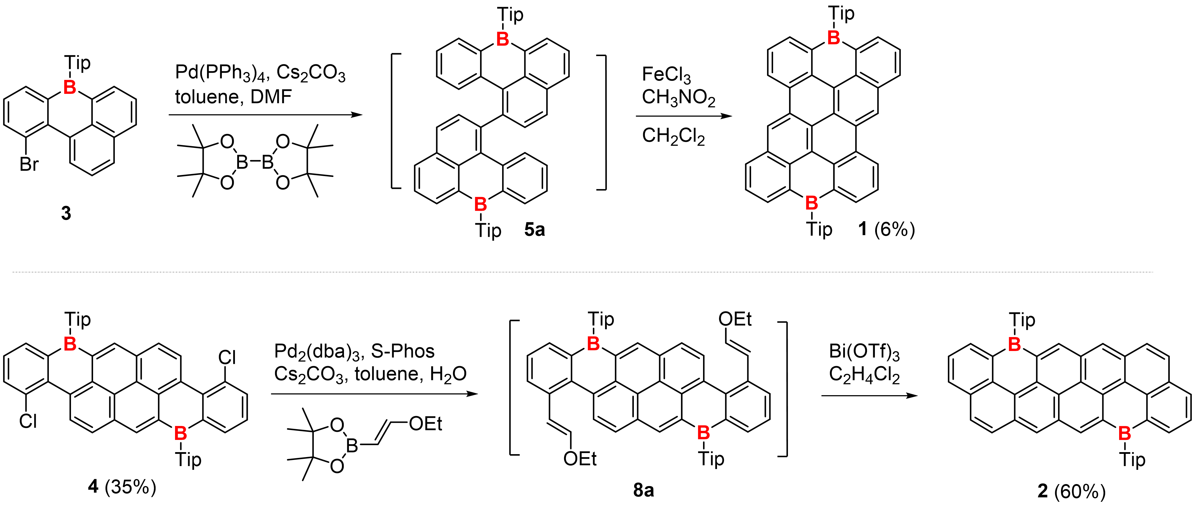 课题组设计合成了双硼掺杂单元4,其可看作对硼杂单元3进行横向双重稠并,为构建硼杂并苯体系奠定了关键结构基础(图2)。基于硼烷可控环合策略,通过实施FeCl3和Bi(OTf)3介导的分子内成环反应,制备出两例硼杂二维并苯(1和2)。单晶结构表明,二者具有C32B2同分异构的硼碳共轭骨架,两个硼原子位于彼此平行的锯齿边缘上,可分别看做将两个硼原子掺杂进superzethrene(SZ)和peri-pentacenopentacene(PP)中,形成了硼杂Z型及双层并苯。