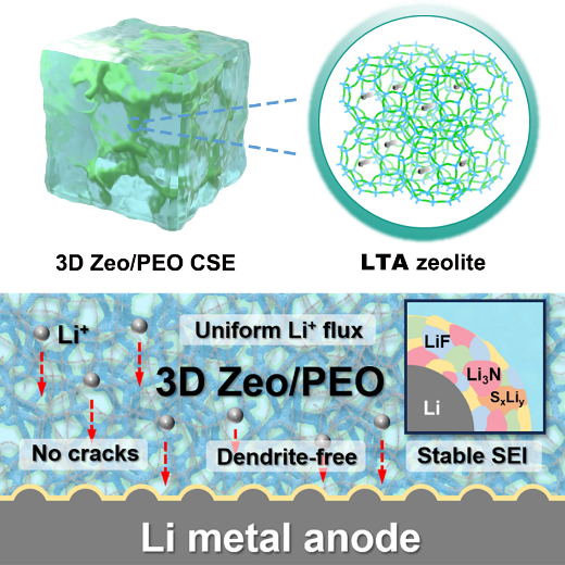 针对上述问题,于吉红教授团队提出了一种新的复合固态电解质设计策略:通过将三维互通的A分子筛网络引入含锂盐(LiTFSI)的聚乙烯氧化物(PEO)基体中,成功构筑了高性能的3D Zeo/PEO复合固态电解质。研究结果表明,三维分子筛网络在复合电解质中不仅为锂离子提供了连续、高效的传输通道,而且通过分子筛与聚合物及锂盐之间的路易斯酸碱相互作用,有效促进了锂盐的解离并抑制了聚合物的结晶行为,从而显著提升了离子传输性能。在室温条件下,该复合电解质的离子电导率可达1.62 × 10−4S cm−1,电化学稳定窗口拓宽至5.7 V(vs. Li+/Li),远优于传统的PEO基固态电解质(3.23 × 10−6S cm−1, 4.9 V)。同时,三维分子筛网络结构能够有效调控锂离子沉积行为,并诱导形成以LiF、Li3N和LixSy等无机组分为主的稳定固态电解质界面层(SEI)。因此,基于该复合电解质构建的锂对称电池在室温下实现了长达2300小时的稳定循环(过电势仅为0.13 V);组装的全电池同样表现出优异的倍率性能和长期循环稳定性(室温下500次循环后容量保持率高达92%)。该研究工作通过材料选择与结构设计的协同调控,为构筑兼具高离子电导率、优异界面稳定性和良好安全性的复合固态电解质提供了一种可行策略,对推动新一代高安全、高能量密度全固态锂金属电池的实际应用具有重要意义。