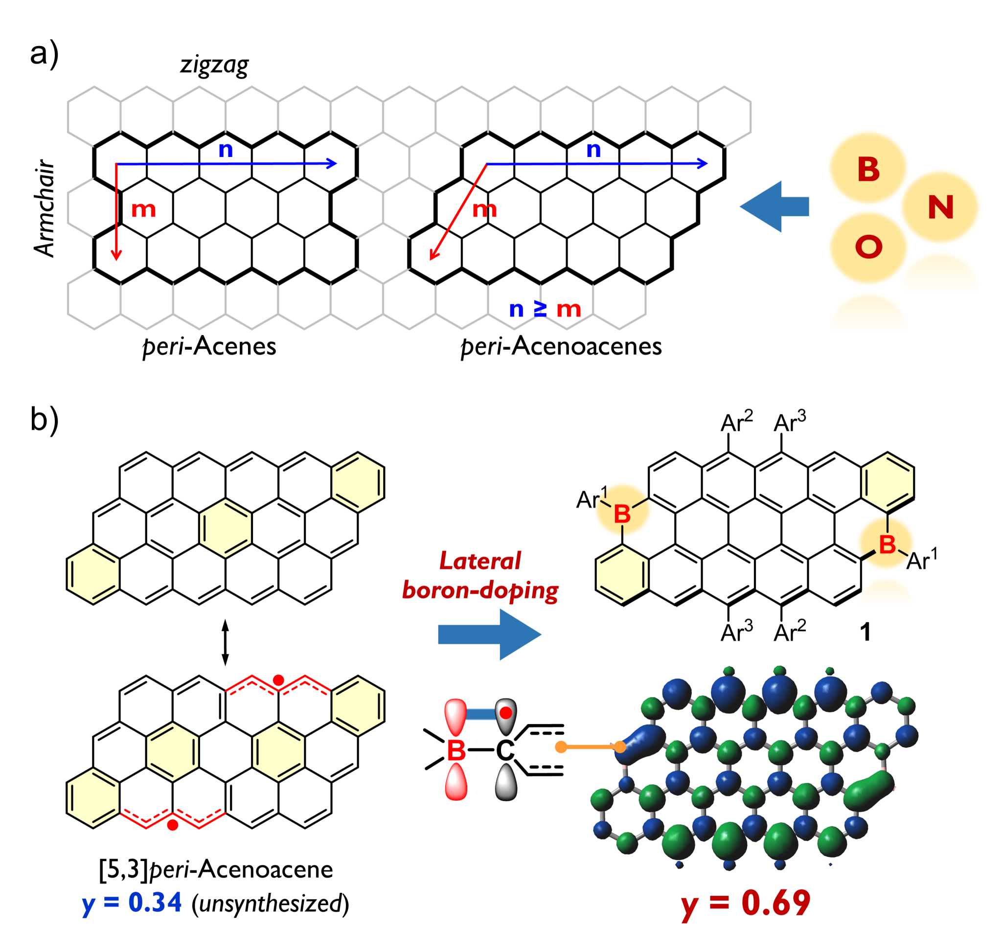 图1.(a)锯齿边缘纳米石墨烯的杂原子掺杂方法;(b)硼杂纳米石墨烯双自由基的分子设计、化学结构和自旋密度图