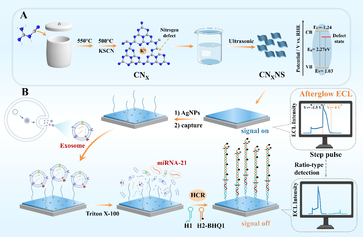 针对这一问题,宋大千教授团队首次提出基于余辉电化学发光的单发光体比率型ECL新策略。研究团队通过缺陷工程调控石墨相氮化碳,构建了具有氮缺陷电子态的碳氮化物材料(CNXNS)。在脉冲电位激发条件下,材料中的缺陷态可暂时储存注入电子,并在电位终止后逐渐释放,从而产生持续发光的余辉ECL现象。由于常规ECL信号与余辉ECL信号来源于同一发光中心,这两种信号天然具有内在关联,可构建无需双发光体的自参考比率检测模式,从根本上避免了传统比率体系中信号不匹配的问题。实验结果表明,在含1 mM S2O82−的0.1M PBS溶液中,对CNXNS修饰的电极施加−1.5 V脉冲电位20 s后,在电激发终止条件下仍可观察到持续约12 s的阴极余辉ECL信号,验证了缺陷态诱导的余辉发光行为。这一发现为构建时间分辨与比率检测相结合的新型ECL分析模式提供了重要基础。在此基础上,作为概念验证,研究团队进一步构建了基于单发光体的比率型ECL传感平台,并将其应用于外泌体microRNA的超灵敏检测。通过杂交链式反应(HCR)在电极表面引入BHQ-1标记的DNA链,实现对常规ECL与余辉ECL信号的差异化调控,从而获得具有内在自校准能力的比率信号输出。该策略有效降低背景干扰,提高检测灵敏度,实现了对miRNA-21的高灵敏检测,并在实际样本分析中表现出良好的应用潜力。